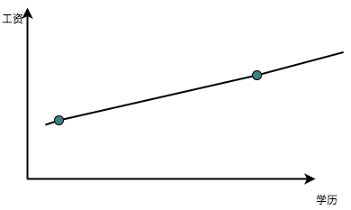 - 最小二乘 设想一个例子,教育程度和工资之间的关系。我们观察到的数据无非就是一个教育程度,对应着一个工资。我们希望的自然是找到两者之间的规律:如果把教育程度的初中、高中、大学、研究生及博士定义为1234的话,我们希望找到类似于工资=1000 +2000x教育程度 的这种规律,其中1000和2000是我们需要从数据里面发现的,前者称之为底薪,后者称之为教育增量薪水。如果我们就观察到两个数据,那解起来很简单,直接把两个数据带进去,二元一次方程组,就得到底薪和教育程度增量薪水之间的关系。这个在图上就体现为两点决定一条直线:
