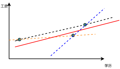 那怎么取平衡呢?那我们现在必须引入误差的存在,也就是我们要承认观测到的数据中有一些因素是不可知的,不能完全的被学历所解释。而这个不能解释的程度,自然就是每个点到红线在Y轴的距离。 但是我们尽管痛苦的承认了有不能解释的因素,但是我们依然想尽可能的让这种『不被解释』的程度最小,于是我们就想最小化这种不被解释的程度。因为点可能在线的上面或者下面,故而距离有正有负,取绝对值又太麻烦,于是我们就直接把每个距离都取一个平方变成正的,然后试图找出一个距离所有点的距离的平方最小的这条线,这就是最小二乘法了,简单粗暴而有效。