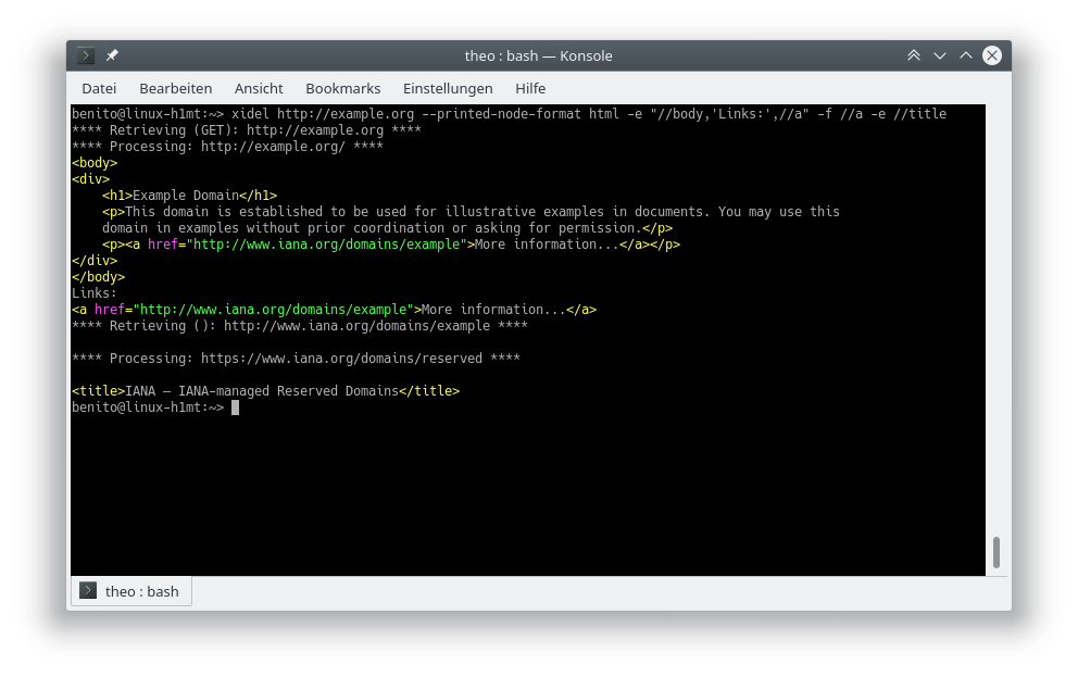 xidel http://example.org -f //a -e //title