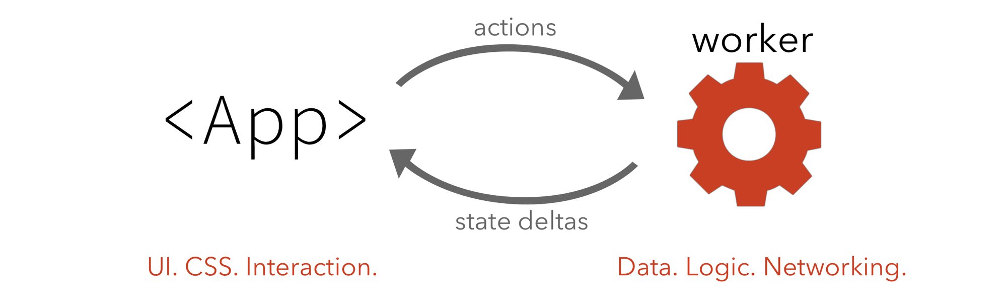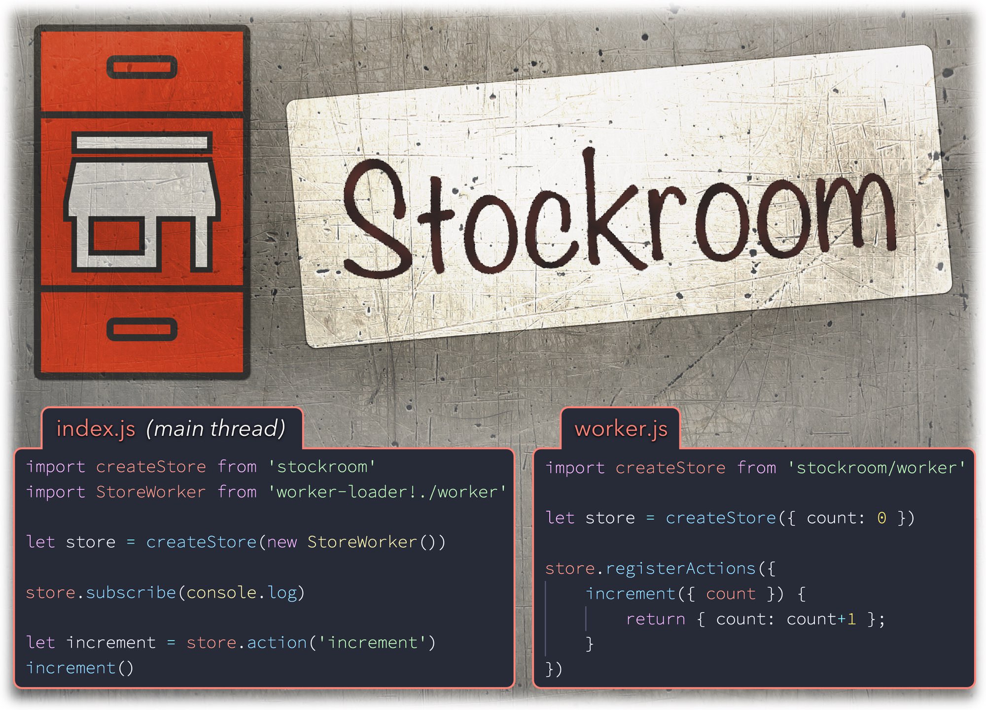 We'll have two files: index.js and worker.js. The first is what we import from our app, so it runs on the main thread - it imports our worker (using worker-loader or workerize-loader) and passes it to Stockroom to create a store instance around it.