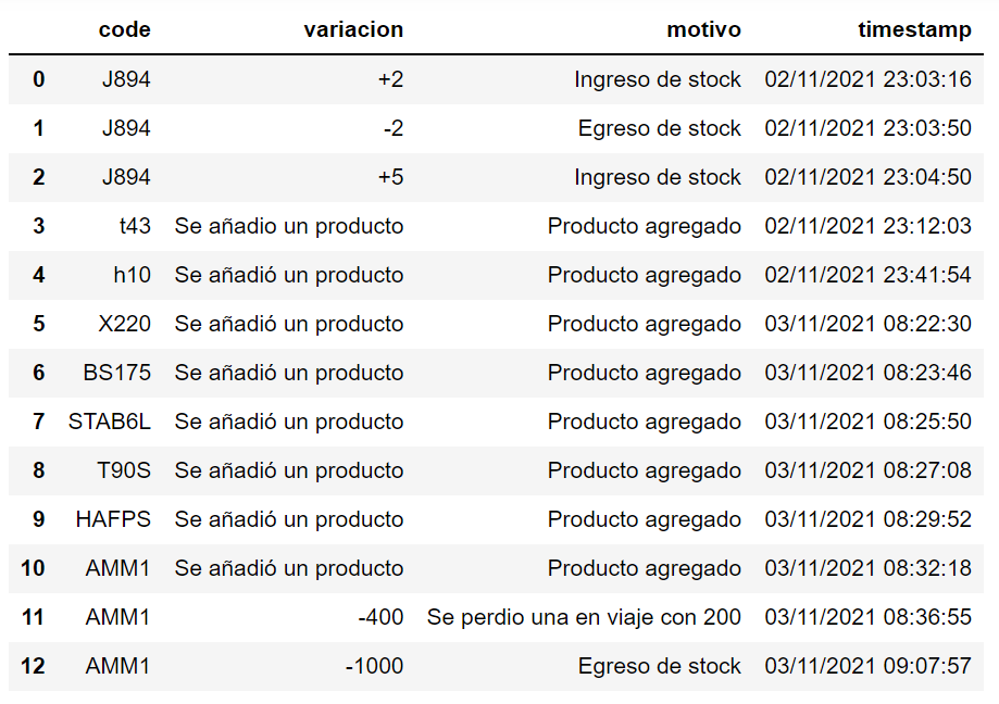 En la parte de registros, optamos por almacenar en cada uno de los ajustes el código del producto, la variación del stock, el motivo por el cual se realiza el cambio, y la fecha y hora de actualización (timestamp).