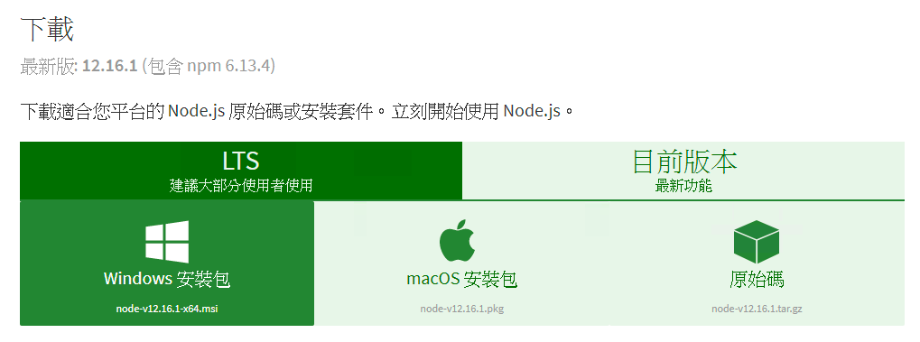 - 至 https://nodejs.org/zh-tw/download/ 網站下載 LTS 版本