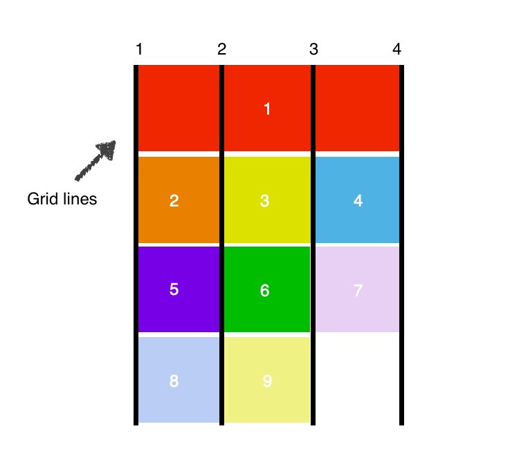 To position and resize the items we’ll target them by using the grid-column and grid-row properties, which define items by grid lines: